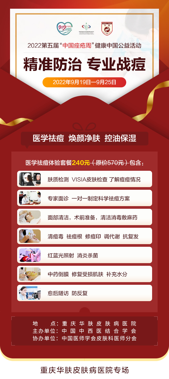 为践行“一带一路”创新驱动助力工程及“健康中国”的战略方针,中国中西医结合学会皮肤性病专业委员会将每年的9月19-26日定为“中国痤疮周”。重庆华肤皮肤病医院积极响应第五届中国痤疮周“精准防治 专业战痘”的主题,组织开展了痤疮知识科普及义诊等一系列活动。